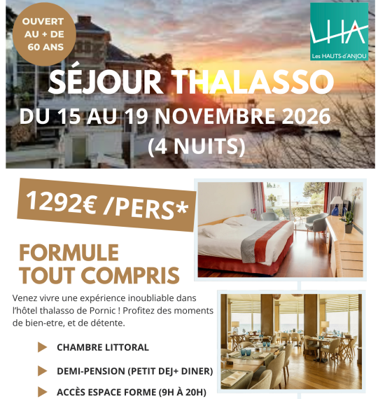 Le service Seniors des Hauts-d’Anjou vous propose un séjour bien-être exceptionnel à Pornic, pendant 4 jours du 15 au 19 novembre, dans un hôtel thalasso face à l’océan.